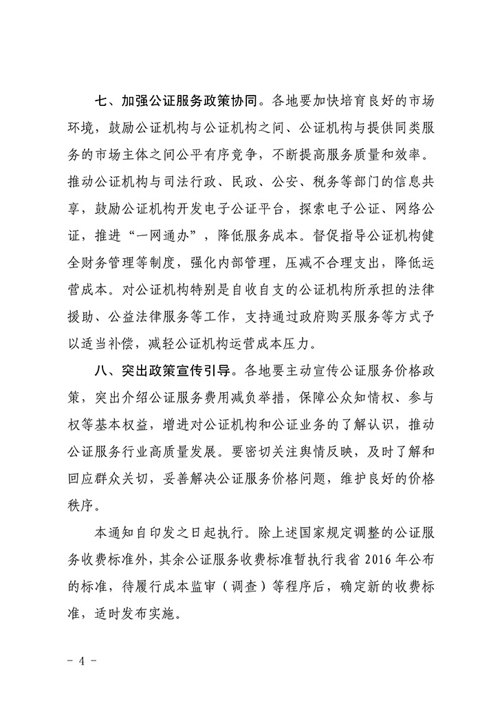 第五條 公證服務(wù)收費(fèi)標(biāo)準(zhǔn)以公證機(jī)構(gòu)提供公證服務(wù)的社會(huì)平均成本為基礎(chǔ),根據(jù)辦理公證事項(xiàng)所需人數(shù)、時(shí)間和疑難、復(fù)雜及風(fēng)險(xiǎn)程度,按照有利于公證事業(yè)可持續(xù)發(fā)展和兼顧社會(huì)承受能力的原則確定。
